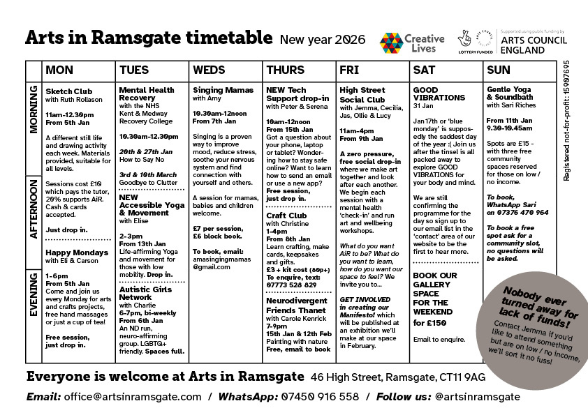 Arts in Ramsgate exists to run inclusive low / no cost art, craft, music, and wellbeing community sessions where everyone is welcome.