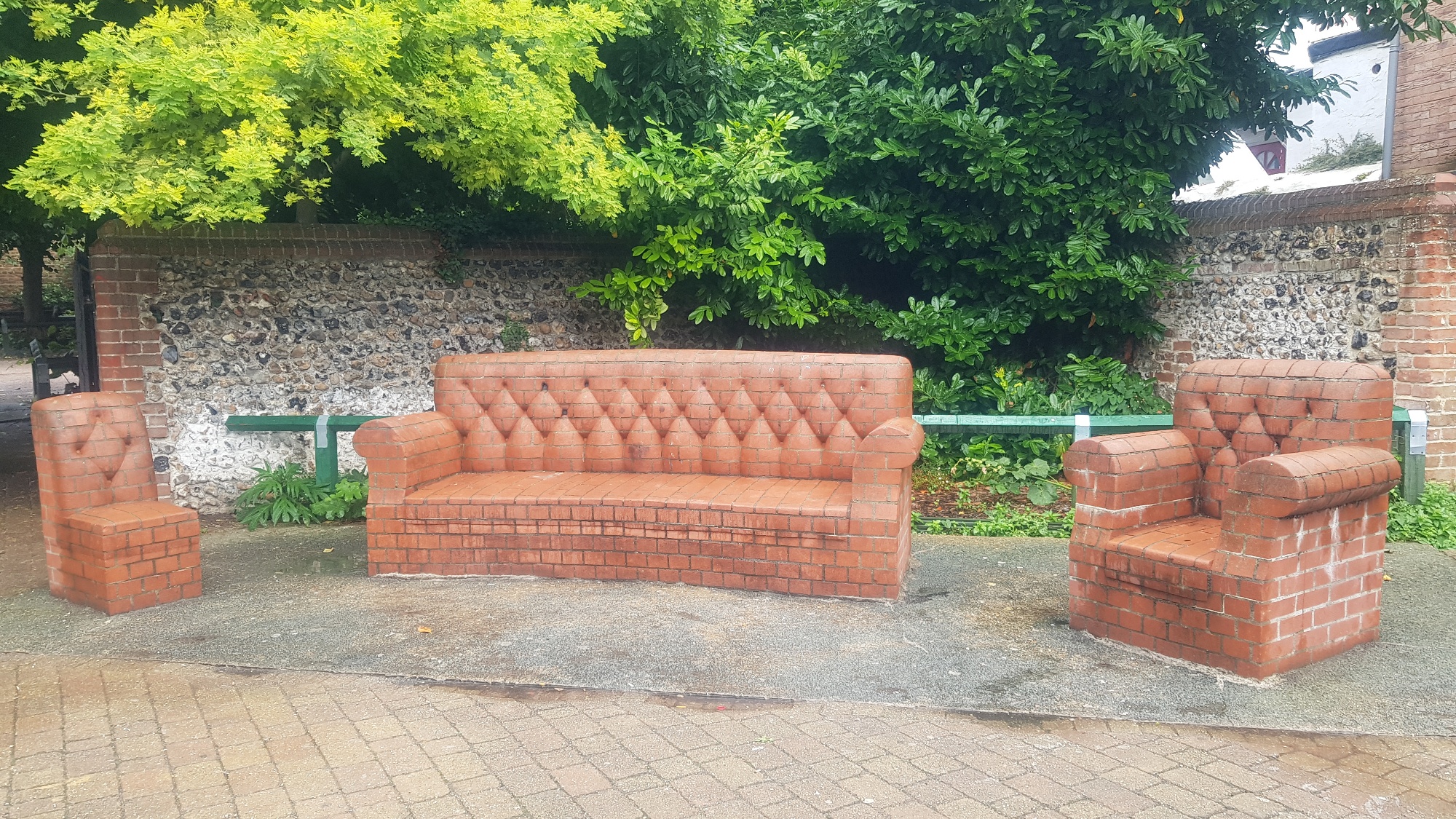 A three piece furniture suite made entirely of red brick, fixed in the Albert Square courtyard area between York Street and Charlotte Court called ‘Upholstered Brick Three Piece Suite’.