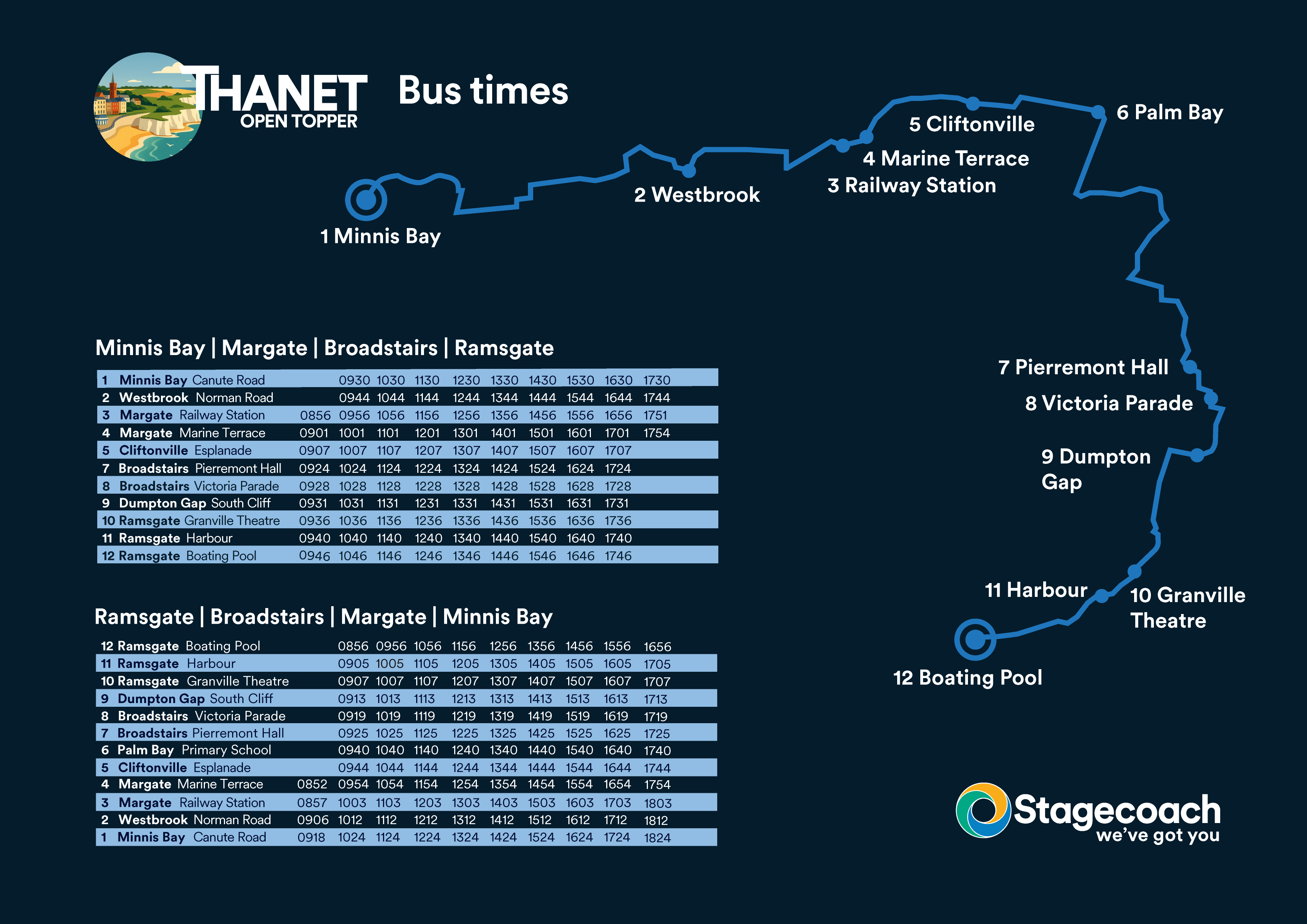 Thanet Open Top Day Tickets are £8 for adults and £5 for under 19s and concessions. A Group Ticket can also be purchased at £22 for up to 5 people and under 5s travel free. Thanet Open Top Day Tickets allow unlimited hop-on, hop-off all day and are valid on all Stagecoach buses within the Thanet DayRider zone. For full fare info, please click here