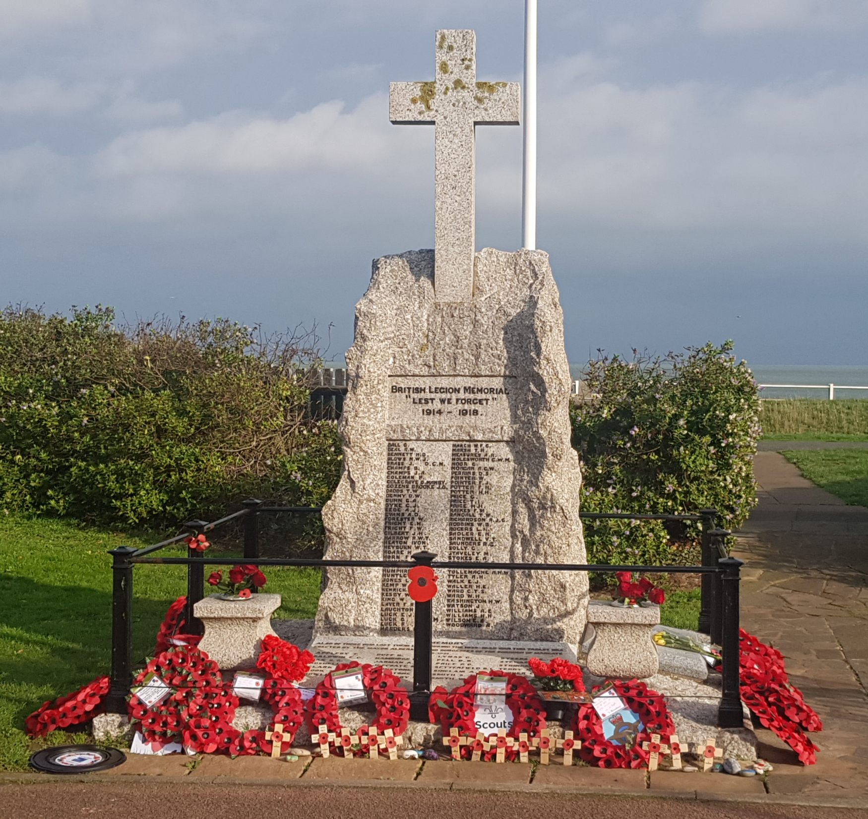 Memorial commemorates the residents of Westgate-on-Sea who were killed or missing in World War I (79 names) and World War II (29 names).