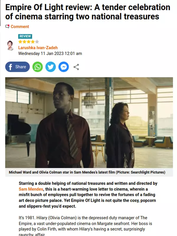 EMPIRE OF LIGHT was released in cinemas on Monday 9 January 2023. Read what the papers say