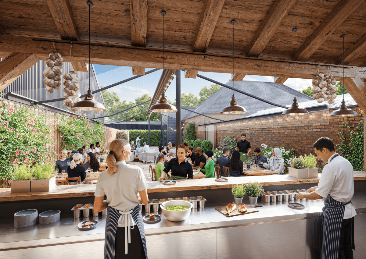 Guests will be able to watch chefs cook over open flames using a bespoke barbecue grill, traditional spit roast, Big Green Egg and wood-fired pizza oven - all within a relaxed, garden-inspired courtyard setting