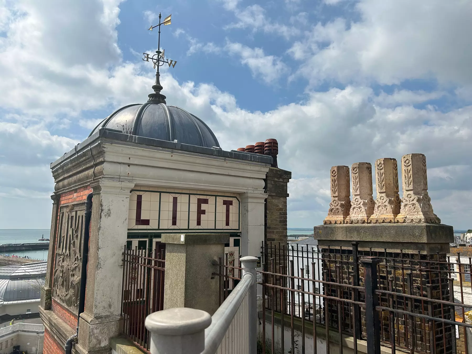 Nearly 10 years younger than its East Cliff sister, the structure has a distinct Art Deco look, particularly as seen from its seafront base. Built of rendered concrete, the original had capacity for 20 passengers and the tall pylon-like central shaft was fitted with glass panels, graded from dark blue at the bottom to white at the top (these have since been replaced with Perspex). When in service (until 1993), it linked Westcliffe Promenade to what is now the roundabout on Royal Harbour Approach. The structure (lift, shaft and engine house) was sold at auction in 2021 but for now its future is uncertain.