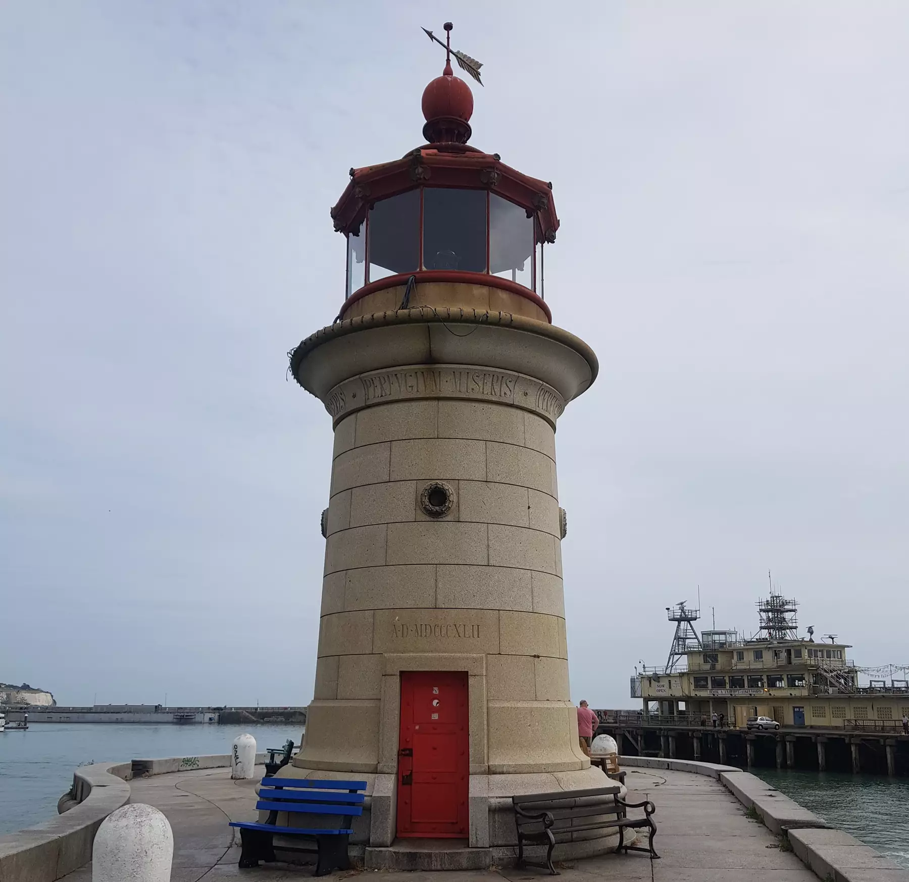 Designed by John Shaw Junior (who also designed London’s Royal Naval School and buildings at Eton College), this cylinder of Cornish granite, topped by an octagonal glass lantern sits on the end of the west pier, which curves a protective arm around the harbour. Built to replace an earlier lighthouse, the Georgian tower is encircled by a carved frieze inscribed (three times) with the Latin words Perfugium Miseris – meaning ‘refuge for those in need’. The lantern – featuring a decorative iron cornice – was originally lit by an oil lamp; today it shows a fixed red electric light. In marine terminology, this is a ‘rear range’ lighthouse, paired with a front range light – set on a pole on the east pier. The two are positioned to line up vertically when an approaching vessel on the right course. For views across the harbour to Ramsgate, it’s worth a stroll along either pier, particularly at dusk